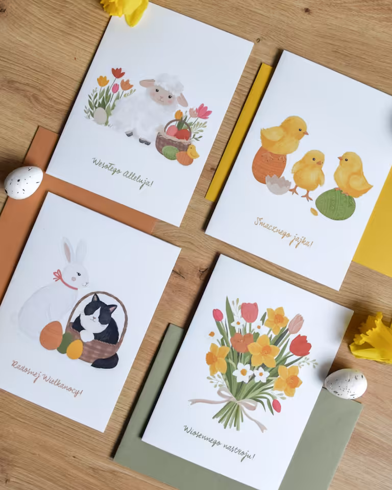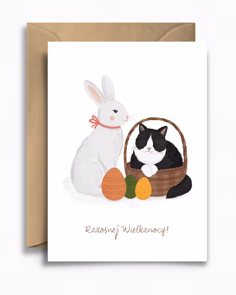 Kartka wielkanocna "Królik i kot" to niezwykle pogodna i pełna uroku propozycja, która z pewnością wywoła uśmiech na twarzy obdarowanej osoby. Urocza ilustracja przedstawia białego, świątecznego królika u boku zrelaksowanego, czarno-białego kota, który wygodnie spoczywa w koszyku, w otoczeniu kolorowych pisanek.