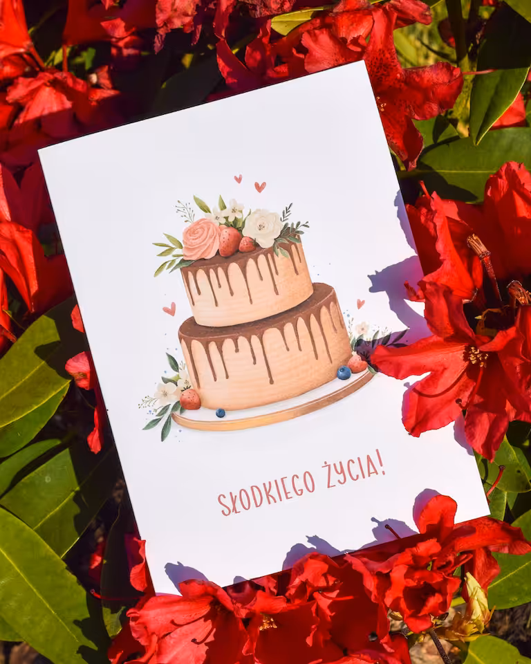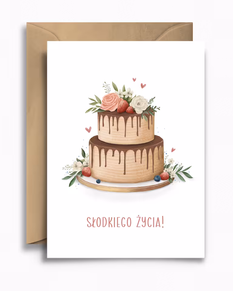 Kartka ślubna „Tort” to propozycja dla wszystkich, którzy chcą przekazać nowożeńcom słodkie życzenia. Na okładce znajduje się ręcznie wykonana ilustracja dwupiętrowego tortu ślubnego z czekoladową polewą, dekoracjami z kwiatów i owoców. Całość dopełnia radosny napis: „Słodkiego życia!”.