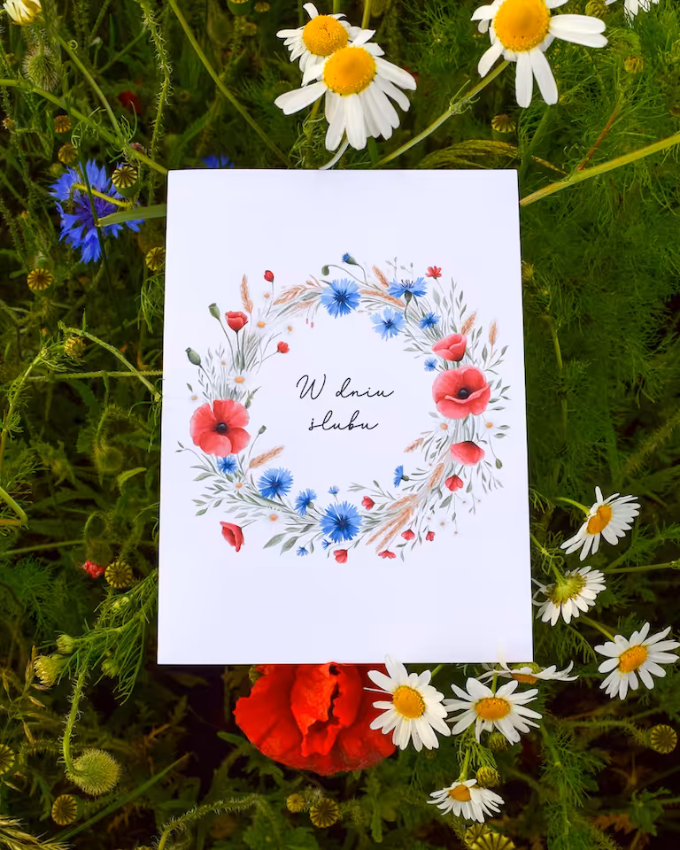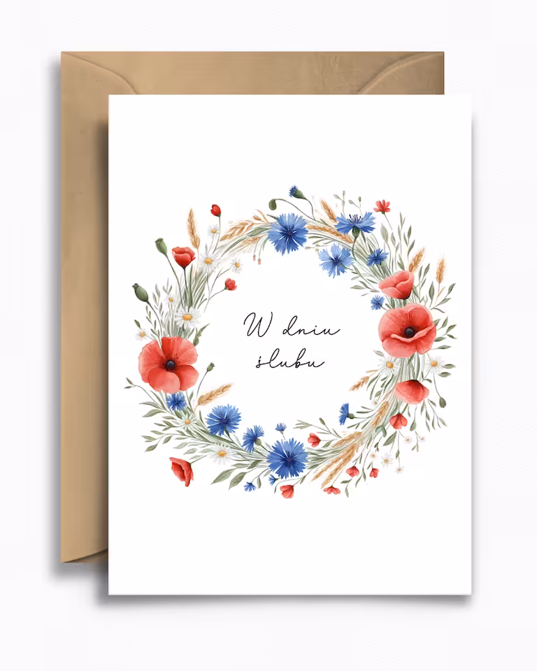 Kartka ślubna „Polne kwiaty” to została stworzona z myślą o miłośnikach natury i romantycznych, sielskich akcentów. Na froncie kartki znajduje się ręcznie wykonany wianek z polnych kwiatów – maków, chabrów, rumianków oraz kłosów zboża – który otacza subtelny napis „W dniu ślubu”. Kompozycja wprowadza w sielski nastrój.