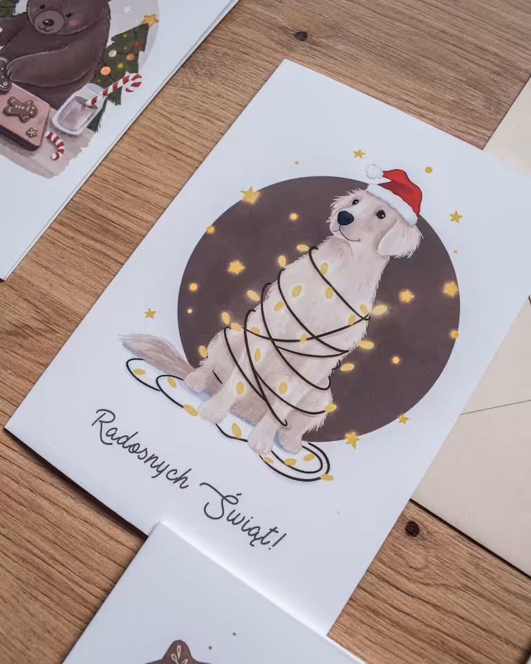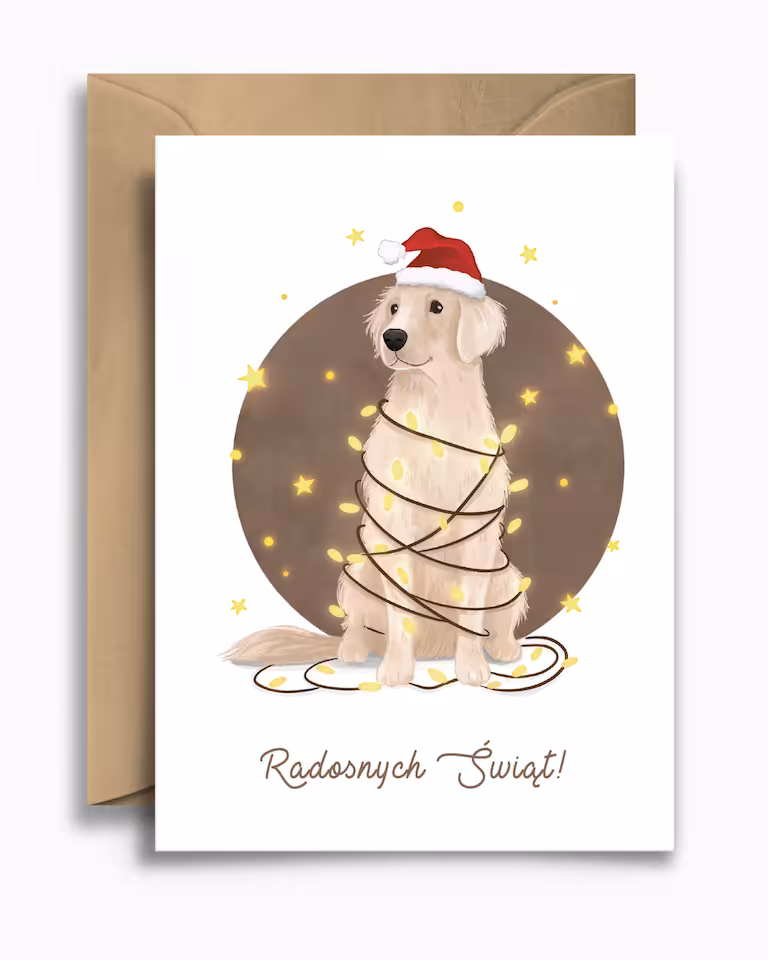 Kartka świąteczna "Pies w lampkach" to idealna propozycja dla każdego miłośnika psów, ceniącego radosny i pełen humoru klimat świąt. Ilustracja przedstawia uroczego labradora w czapce Mikołaja, zaplątanego w ciepłe, migoczące lampki choinkowe, co doskonale oddaje beztroską, świąteczną atmosferę.