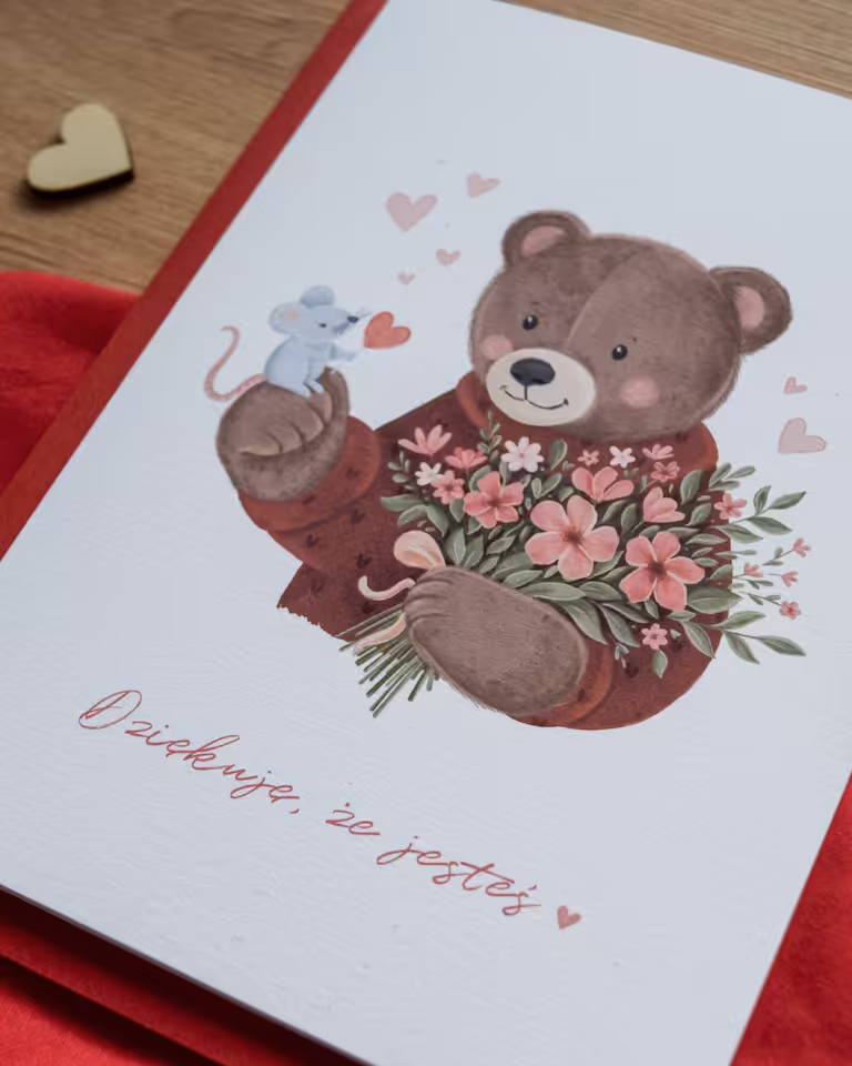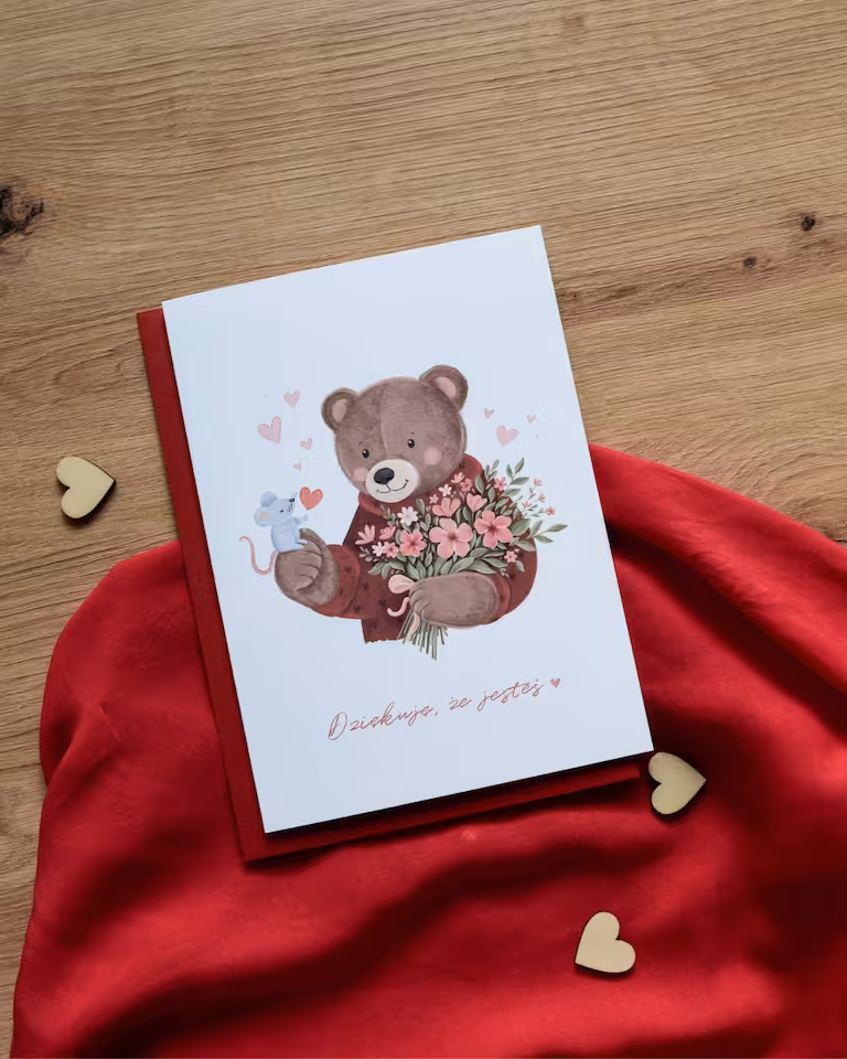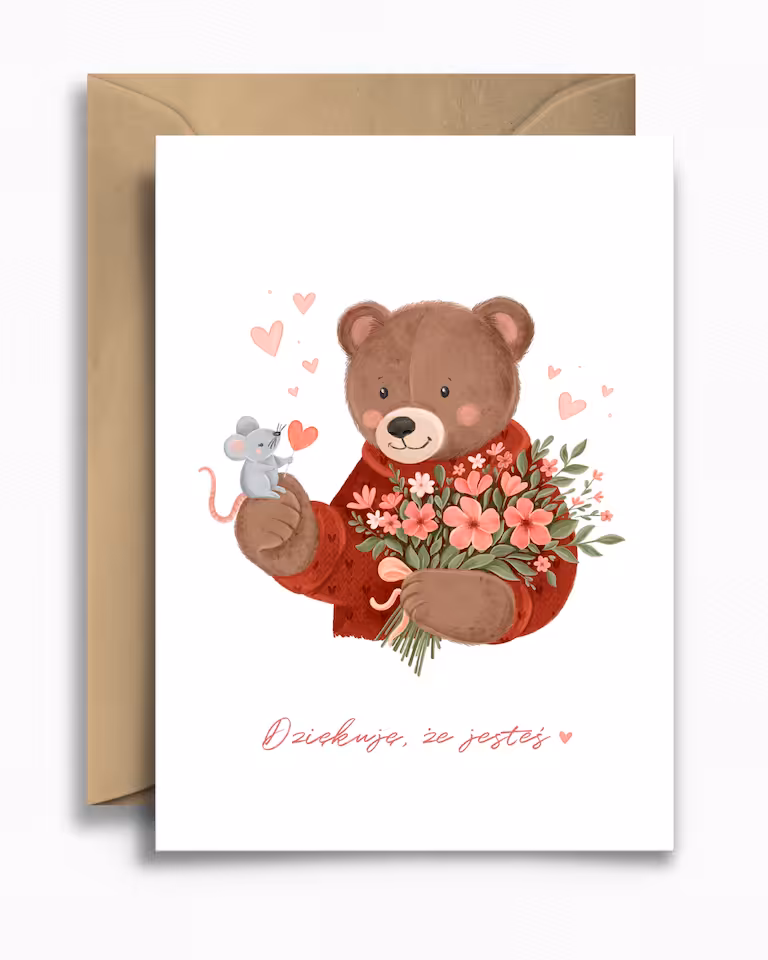 Kartka "Miś i myszka" to uroczy i czuły sposób na wyrażenie wdzięczności i miłości, idealny na Walentynki, Dzień Kobiet, urodziny lub jako wyraz uznania dla bliskiej osoby. Ilustracja przedstawia serdecznego misia w swetrze, trzymającego piękny bukiet kwiatów i małą myszkę, co symbolizuje ciepło i docenienie.