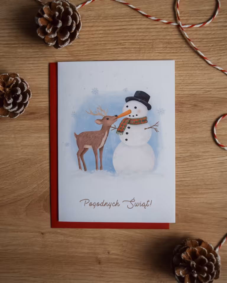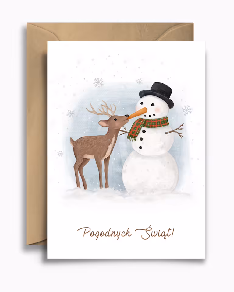 Kartka świąteczna "Sarna i bałwan" to niebanalna i pełna ciepła propozycja, która wprowadzi w pogodny nastrój. Urocza ilustracja przedstawia sarnę, która z ciekawością bada nos z marchewki eleganckiego bałwana. Ta nietypowa i rozczulająca scena z zimowego lasu idealnie nadaje się do przekazania życzeń.