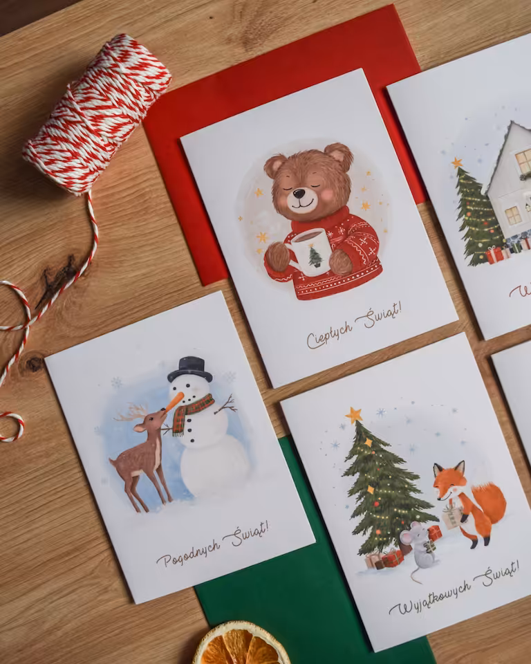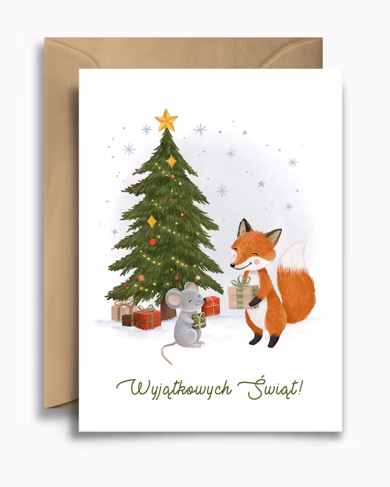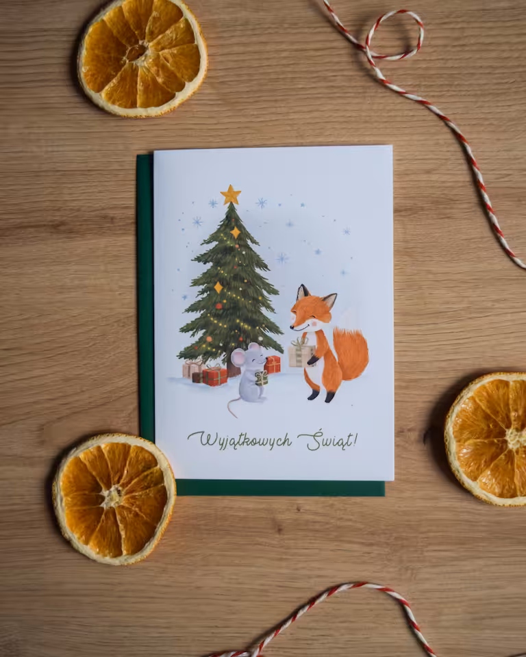 Kartka świąteczna “Myszka i lis” to zabawna i urocza propozycja, która z pewnością wywoła uśmiech u obdarowanej osoby. Ręcznie rysowana ilustracja przedstawia leśnych przyjaciół – sprytnego lisa i uroczą myszkę – w świątecznej scenerii, przy choince i prezentach. Jest to idealny wybór dla tych, którzy chcą złożyć bliskim życzenia z nutą humoru i oryginalności.