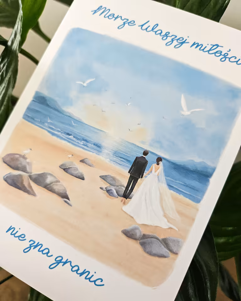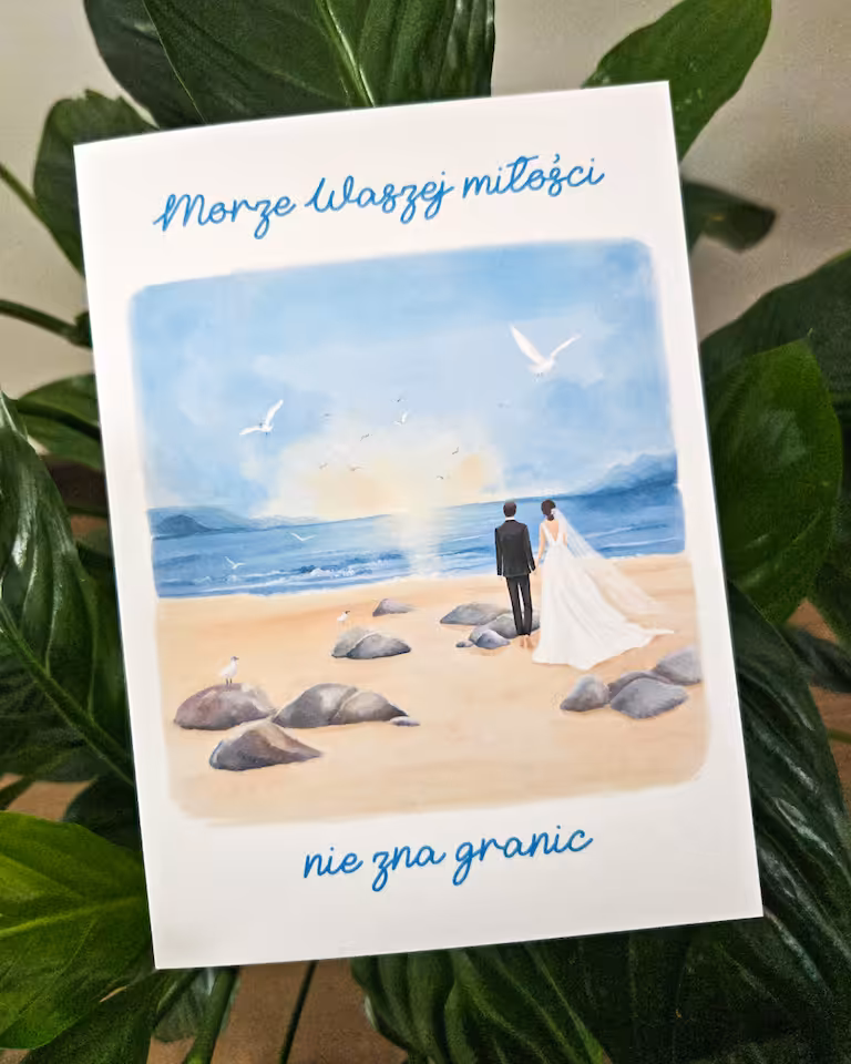 Kartka ślubna „Para nad morzem” to idealna propozycja dla zakochanych, których łączy miłość do morskich krajobrazów i szumu morza. Ilustracja przedstawia nowożeńców spacerujących brzegiem morza, w otoczeniu ciepłych, pastelowych barw i romantycznej atmosfery. Całość dopełnia symboliczny napis: „Morze Waszej miłości nie zna granic”.