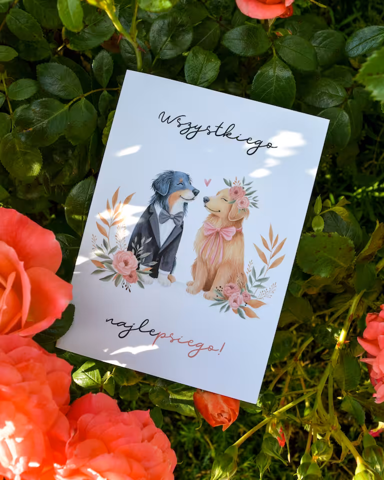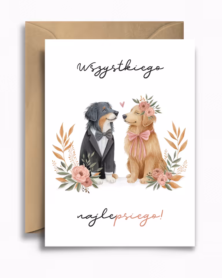 Kartka ślubna „Pieski” to pełna uroku i poczucia humoru propozycja dla miłośników czworonogów i niebanalnych wzorów. Na okładce znajdują się dwa urocze psy – pan młody w eleganckim garniturze oraz panna młoda w kwiatowej ozdobie i kokardce. Ilustracja jest pełna detali i ciepła, a uzupełnia ją zabawny, dwuznaczny napis: „Wszystkiego najlepsiego!”.
