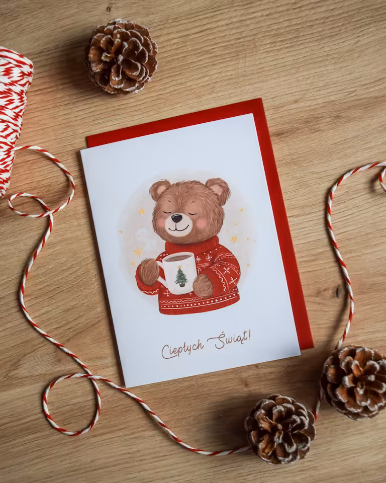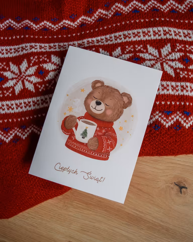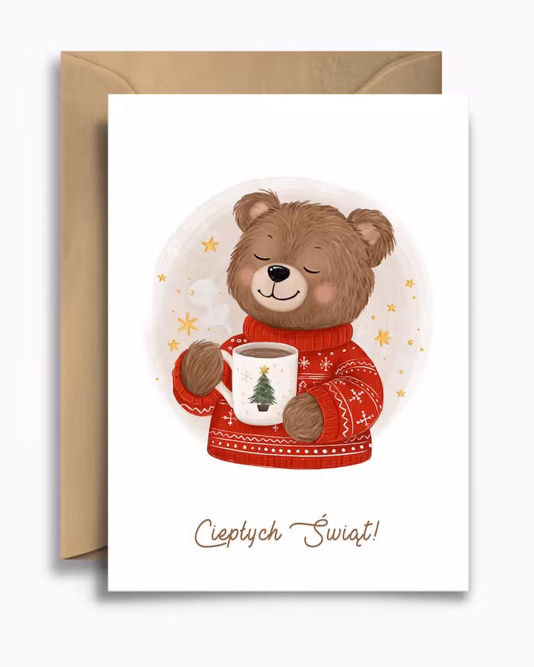 Kartka świąteczna "Miś z czekoladą" to esencja ciepła i przytulnej atmosfery Bożego Narodzenia. Ilustracja uroczego misia w świątecznym swetrze, popijającego gorącą czekoladę, idealnie oddaje magię i spokój zimowych wieczorów. To doskonały sposób, aby w osobisty i serdeczny sposób złożyć najbliższym życzenia Ciepłych Świąt!