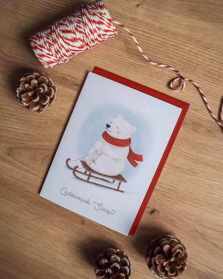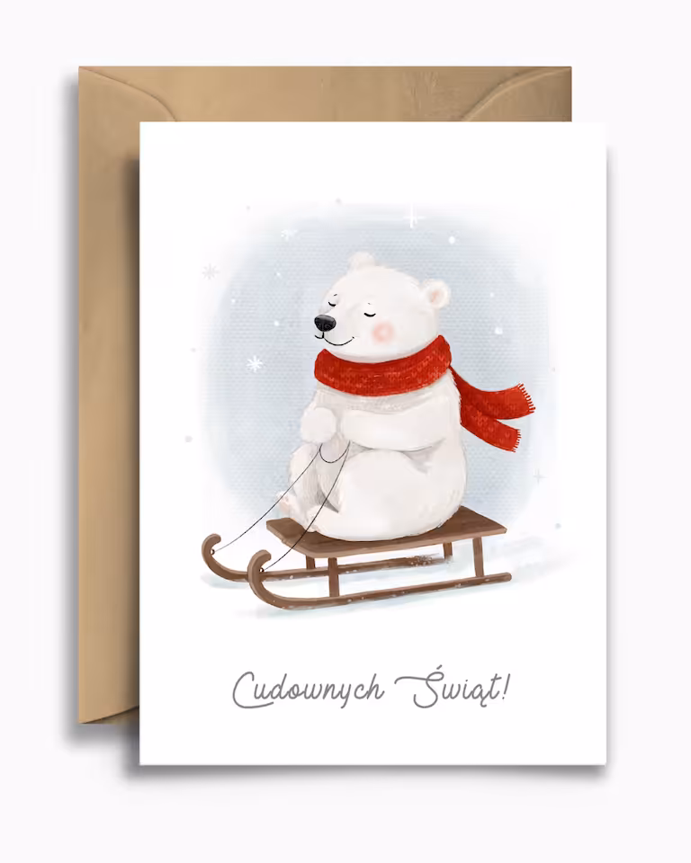 Kartka świąteczna "Niedźwiadek na sankach" to uosobienie zimowej radości i beztroski. Urocza ilustracja białego niedźwiedzia w ciepłym, czerwonym szaliku, sunącego na sankach, tworzy niezwykle pozytywny i ciepły nastrój.