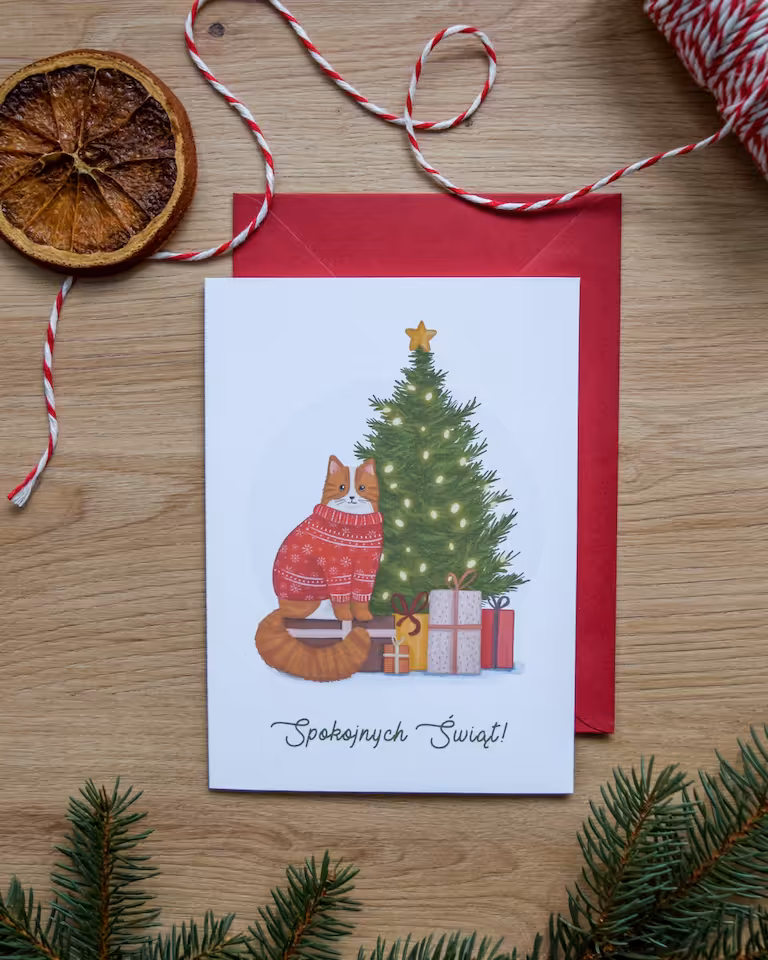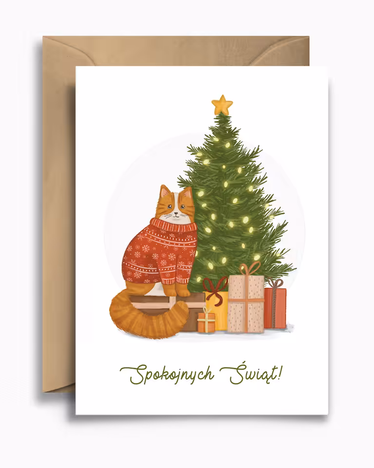 Kartka świąteczna "Kot przy choince" to urocza propozycja dla miłośników czworonogów i ciepłej, domowej atmosfery. Ilustracja przedstawia rudego kota w świątecznym sweterku, siedzącego obok udekorowanej choinki i stosu prezentów, co doskonale oddaje błogi i spokojny nastrój świąt.